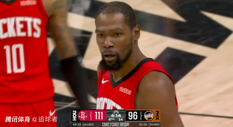 北京时间4月8日,NBA常规赛火箭客场21分逆转太阳,杜兰特全场20投8中、三分9中5拿到24分4篮板3助攻,与狄龙当面互喷并且晃倒狄龙,带领火箭在客场完成21分大逆转,并且彻底终结太阳直通季后赛。
