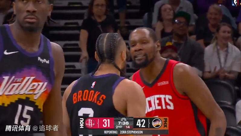 第二节场上形势大变,太阳进攻哑火,火箭单节33-20追回13分,这一节杜兰特找回手感,晃倒狄龙后急停中投得分,外线接连命中两记三分球,单节7中3拿到11分,半场打完火箭54-57仅落后3分;期间杜兰特和狄龙面对面激烈互喷,之后KD晃倒狄龙并且跳投得分。