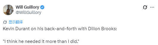 在谈到这场比赛的火药味时,杜兰特说道:“对方一上来就给了我们一记重击,而且两队本来就有恩怨,所以我们知道这会是一场火药味很浓的比赛。我们带着冲劲上场,就像打季后赛一样,这就是这类比赛的氛围。我很满意我们顶住了压力,大家团结在一起,挨过开局那波冲击后反超了比分。”