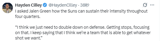 在谈到太阳队一度领先21分却输掉比赛时,格林说道:“我们只在前两节打得像样,这远远不够。对手这支球队很擅长抢二次进攻得分,我们必须做好卡位。”