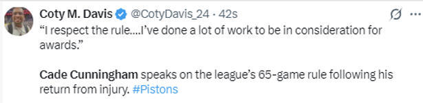 在谈到NBA是否该修改65场规则时,坎宁安表示:“我对此想法挺复杂的。联盟制定这条规则,初衷是希望球星们能多上场、不随意轮休,毕竟球迷花了不少钱来看我们比赛。这一点我非常理解,也很尊重。我知道球迷是来看我打球的,我也希望自己能随时出战,为大家献上精彩的表现。从这个角度来说,我认可这条规则,它有它的道理。