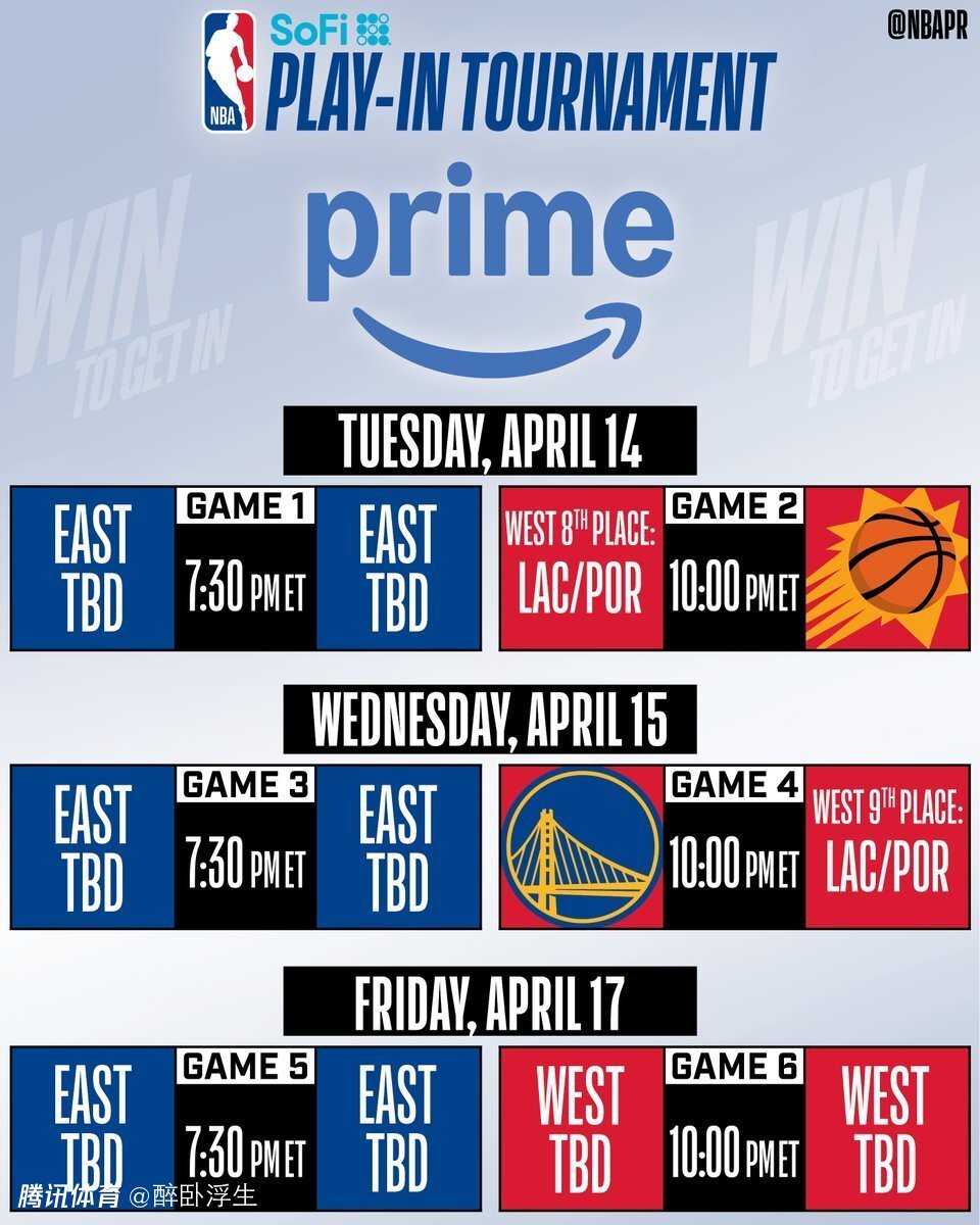 北京时间4月9日, NBA官宣今年附加赛的完整赛程,将在4月15日-18日展开6场争夺,首场附加赛是4月15日东部第八对阵东部第七,第二场是太阳对阵快船或者开拓者,而勇士将在4月16日对阵快船或者开拓者。