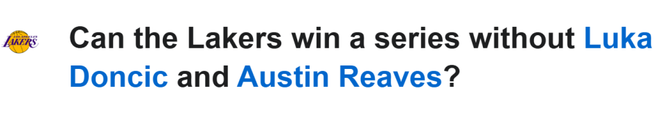 北京时间4月10日,ESPN的两大名记讨论季后赛,其中备受关注的一个话题,就是缺少了东契奇和里夫斯的湖人,能否在詹姆斯的单核率领下赢得一轮系列赛?