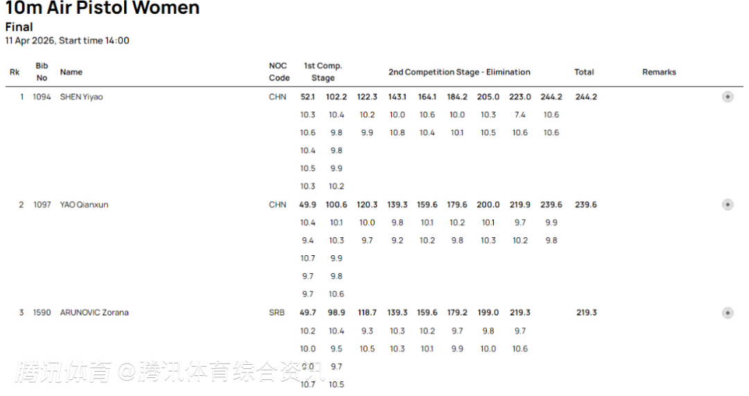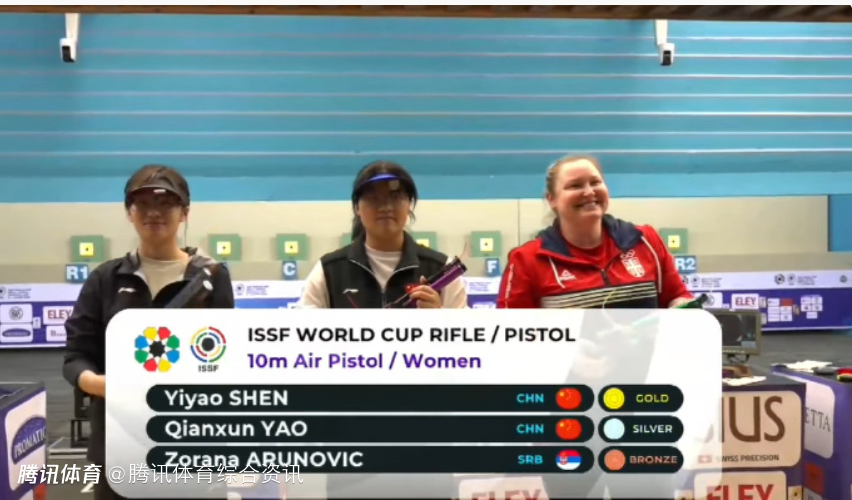 北京时间4月11日,射击世界杯女子10米气手枪比赛,中国选手包揽冠亚军。首次参加世界杯的沈奕瑶在决赛中一路领先最终夺冠,成绩为244.2环,另一位中国选手姚千寻和塞尔维亚选手阿鲁诺维奇分获银铜牌,另外一位中国选手马千珂名列第六。