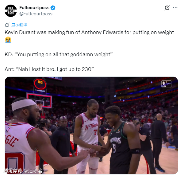昨天火箭在主场惜败森林狼,再加上湖人赢球,火箭彻底无缘西部前四,排名锁定西部第五;杜兰特空砍33分7篮板7助攻,赛后杜兰特与爱德华兹拥抱热聊,据美媒透露,当时杜兰特笑着说道:你怎么胖了那么多。