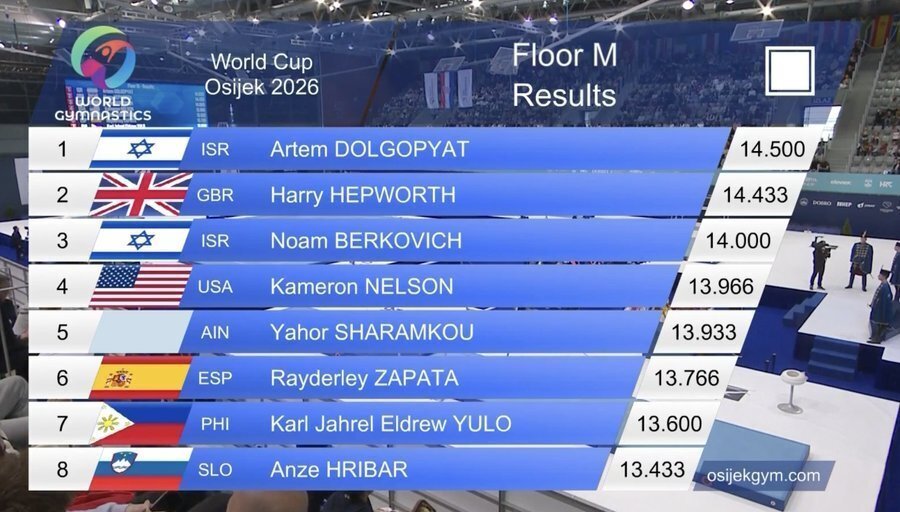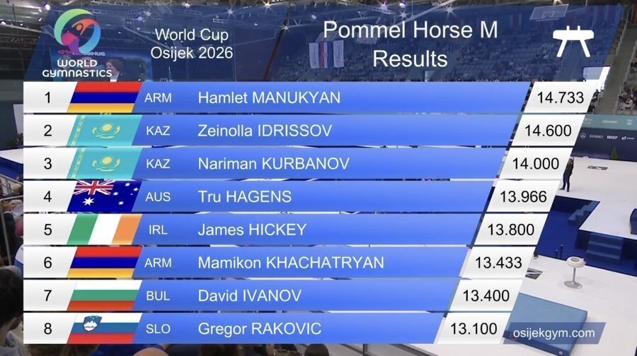 而在两位两个男子项目上,上演了堪比“世锦赛”的强强对话:以色列名将多尔戈菲亚特以14.50拿下自由操冠军;亚美尼亚新秀马努克扬以14.733分问鼎鞍马。