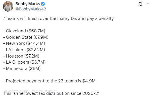 骑士队(6870万美元)、勇士队(6790万美元)、尼克斯队(4440万美元)、湖人队(2220万美元)、火箭队(720万美元)、 洛杉矶快船队(670万美元)、森林狼队(600万美元)。剩余未超过奢侈税线的23支球队,预计每队可获得490万美元分红,这是自2020-21赛季以来最低的一次奢侈税分红。
