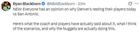 北京时间4月12日,掘金队记者Ryan Blackburn发文,谈到了球队在收官战轮休大量主力球员的选择。该记者表示,掘金此举显然是打算战略性放弃本场比赛,但这只是为了保障球队健康,而非刻意避开森林狼,或是“下棋”想次轮打雷霆。