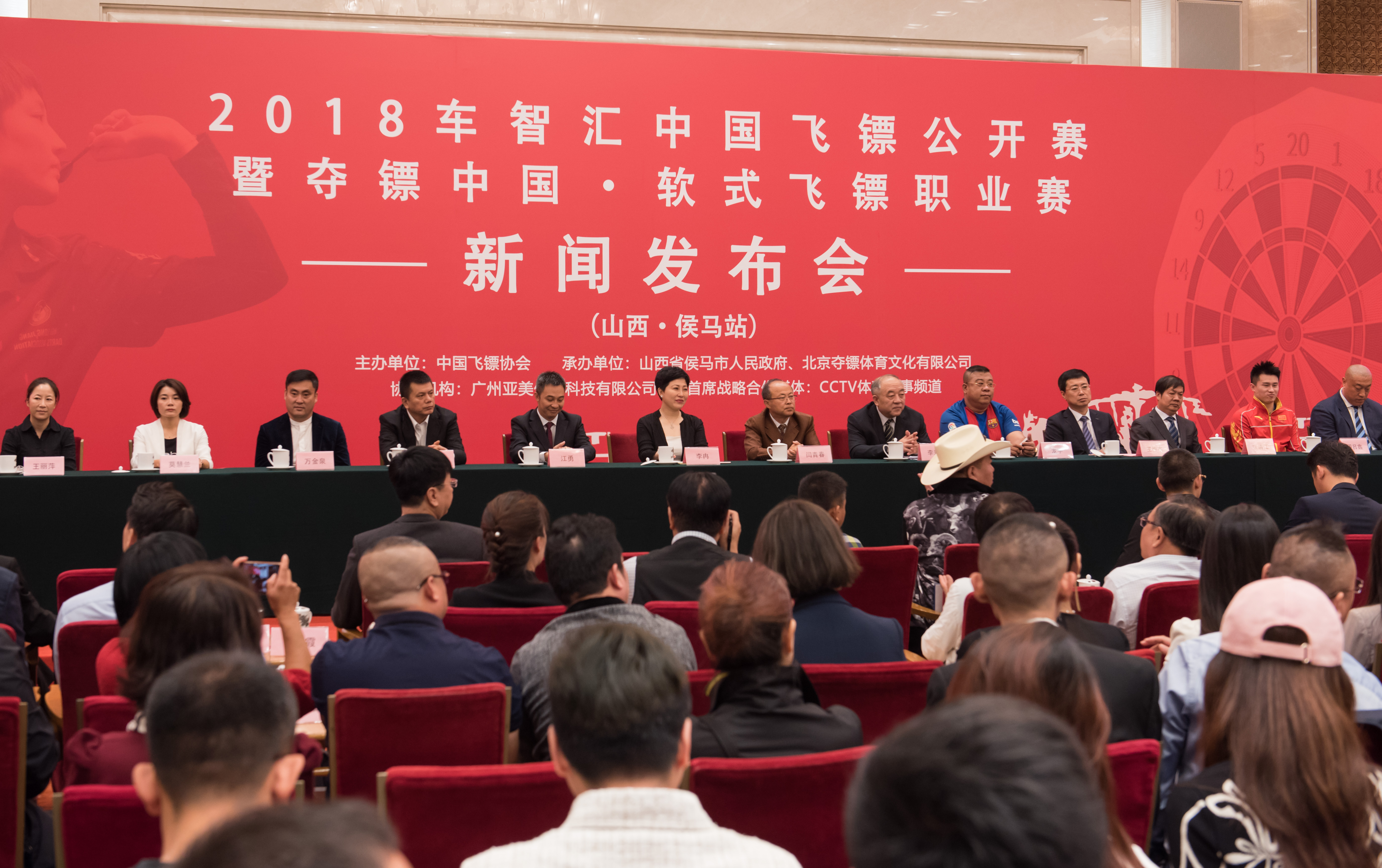 9月26日,“2018车智汇中国飞镖公开赛暨夺镖中国·软式飞镖职业赛新闻发布会”在人民大会堂召开,宣布首站赛落地山西省侯马市,并将于10月19-21日正式开镖。国家体育总局机关党委原常务副书记、中国飞镖协会主席李寿山,全国老龄办原党组成员、副主任闫青春,山西省侯马市市委书记王煦杰,北京夺镖体育文化有限公司董事长李冉,广州亚美信息科技有限公司董事长江勇等领导、嘉宾以及莫慧兰、周吕鑫、马健等众多来自体育界、文艺界知名人士共200余人出席发布会。新华社、人民日报、中央广播电视总台等六十多家媒体参会报道。