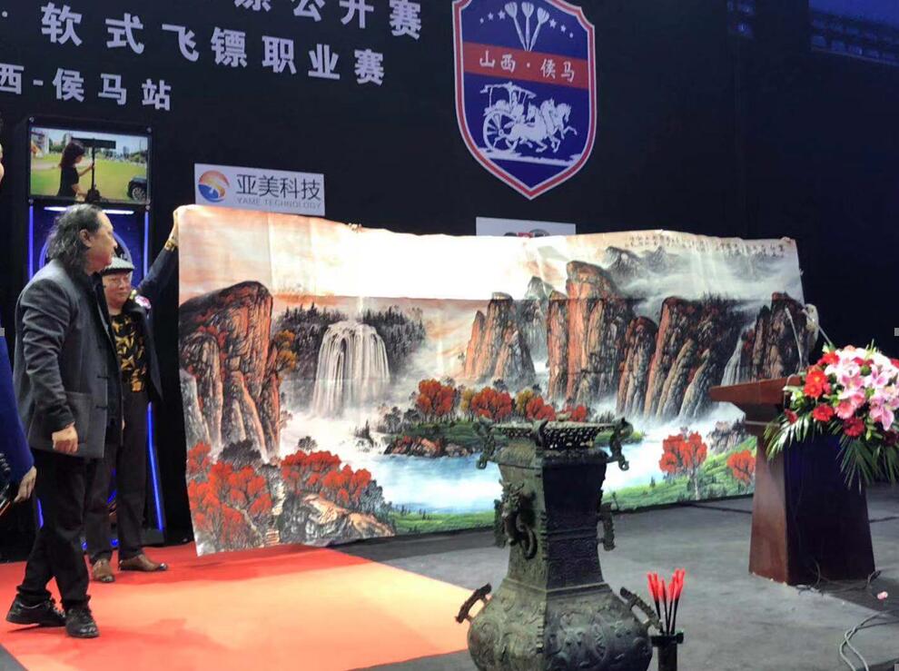 据组委会介绍,飞镖运动具有深厚的传统文化内涵。为普及飞镖文化,本次赛事设置了嘉年华明星赛和职业赛两个部分,得到众多文艺界、体育界知名人士的支持。前篮球国手孙明明,中国NBA第一人马健,著名演员张京海、陈继铭、范炳强、董稚,艺术家周卡、任宝利、孙旭明等众多明星和名人亲临现场,助力飞镖运动推广。三位艺术家周卡、任宝利、孙旭明特意创作了一批作品并赠送给赛事主办方和承办单位。中共山西省侯马市委书记王煦杰,中共山西省侯马市委副书记、市长段慧刚,中国飞镖协会秘书长苏宝生、夺镖体育董事长李冉上台接受捐赠。