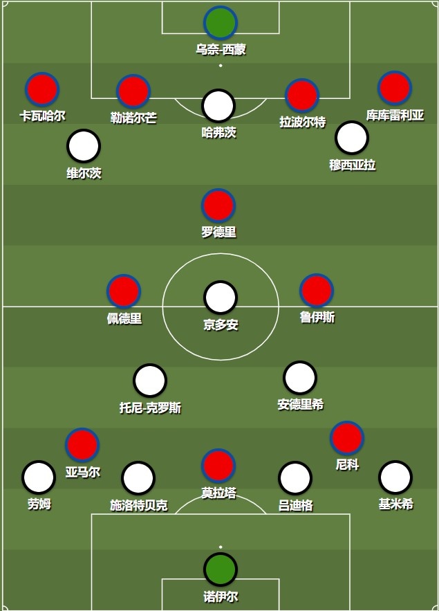 西班牙以4-3-3阵型为主,首发门将是乌奈-西蒙;后防线从左至右分别是库库雷利亚、拉波尔特、勒诺尔芒以及卡瓦哈尔;中场呈现倒三角站位,罗德里出任后腰,他的左侧是鲁伊斯,右侧是佩德里;前场由莫拉塔出任中锋,左路交给尼科-威廉姆斯负责,右路则是16岁的小将亚马尔。